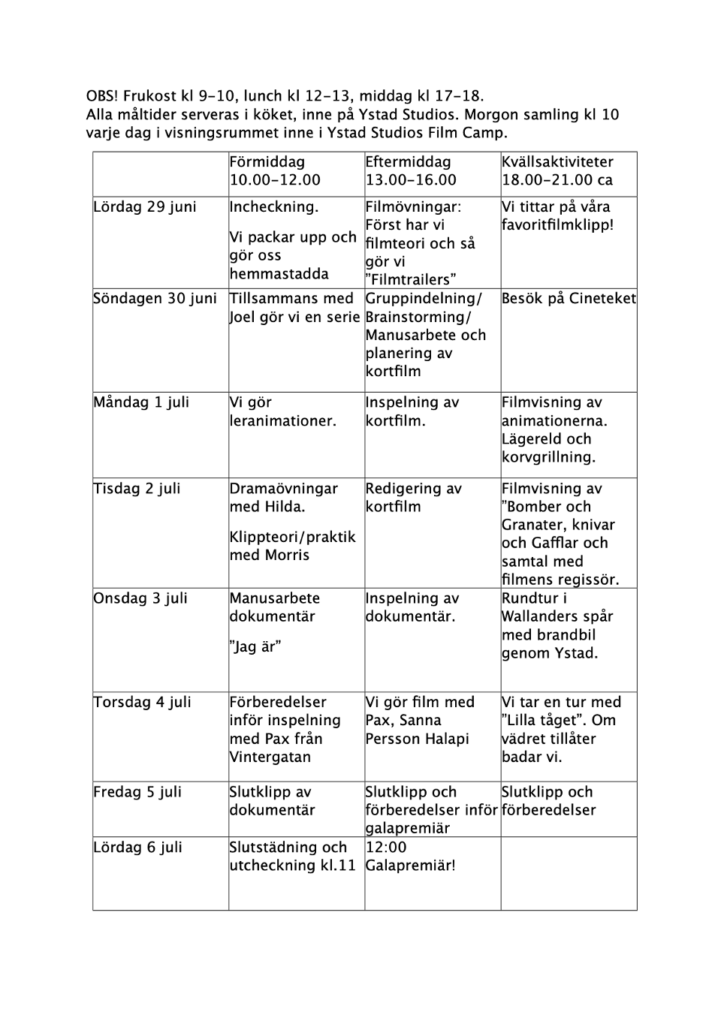 På vårt Filmkollo ska vi bl.a skriva manus, filma i en riktigt studio där många kända filmer spelats in och där rekvisita och scenografi finns kvar som deltagarna på filmkollot kan använda i sitt eget filmskapande, vi ska redigera, titta på film, animera med lera och ha teaterövningar. På kvällarna kommer vi att ha olika kul aktiviteter : Grillning, filmvisningar, sång och musik. Vi kommer att spela spel och ha en massa annat skoj för oss!